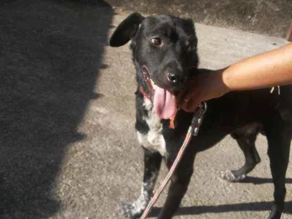 Conheça o Batman, um cachorro macho de 1 ano, alegre e brincalhão. Ele é preto com manchas brancas e está disponível para adoção em Saquarema/RJ.