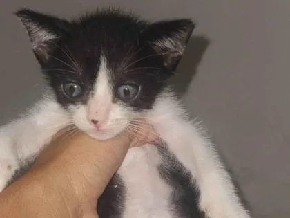 Conheça o Tom, um encantador gatinho macho da raça Angorá! Com sua pelagem branca e preta, ele é um verdadeiro furacão de fofura com menos de 2 meses e porte pequeno.