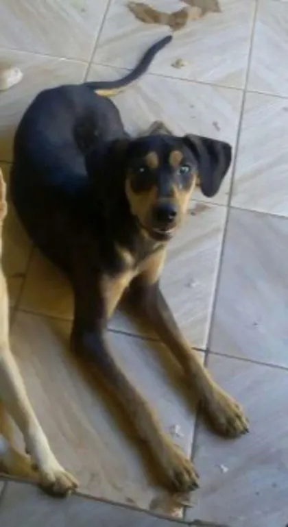 "Conheça o Dedé! ?? Vira-lata macho de 1 ano, preto com amarelo, em busca de um lar cheio de amor em Porto Velho. Dê uma chance a ele!"