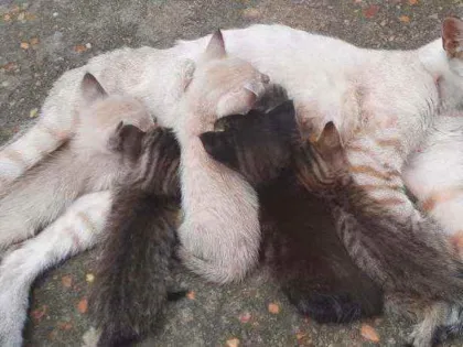 Gata com 6 filhotes abandonados procura lares responsáveis para doação. Mãe magra precisa de cuidados. Encontre alguém que ame gatos.