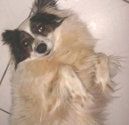 A cadela aparenta ser mais velhinha, é extremamente dócil, adora colo e é super amável.