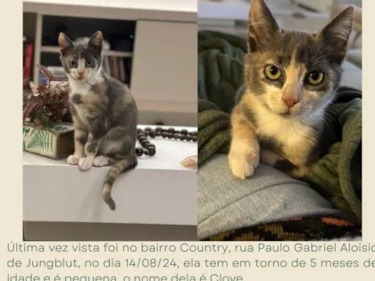 Gata Clove, 5 meses, dócil e sociável, perdida em Cachoeira do