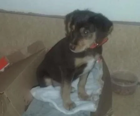 é marrom, tem coleira vermelha, uns 20 cm de altura, olho claro, pelo médio.