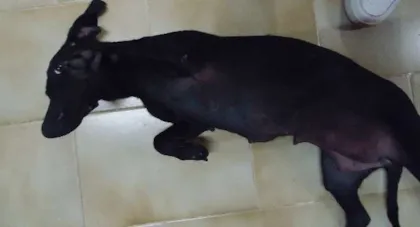 Acreditamos que ela tenha fugido de alguma casa, pois é uma cadela brincalhona, dócil e educadinha. Nem dentro de casa ela entra! Ela também tem um pelo brilhoso e todo pretinho... acreditamos também que ela tenha tido filhotes a pouco tempo, porém, a Pretinha apareceu aqui sozinha. Neste momento Pretinha está na pet tomando banho. Já demos o remédio pra vermes e estamos esperando o tempo certo para podermos dar as vacinas.