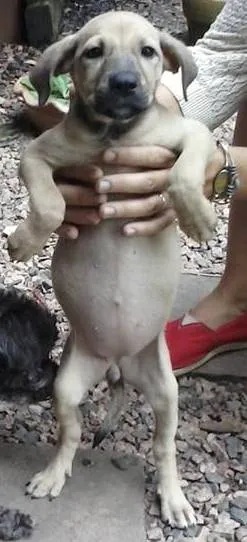 Filhote fêmea está com 60 dias, já come ração e será de porte médio (entre 10 e 12 kg provavelmente). Está desvermifugada.
