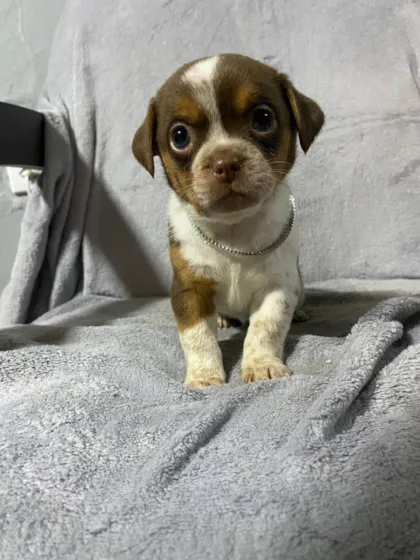 História da Cadela filhote branco/marrom com pintinhas