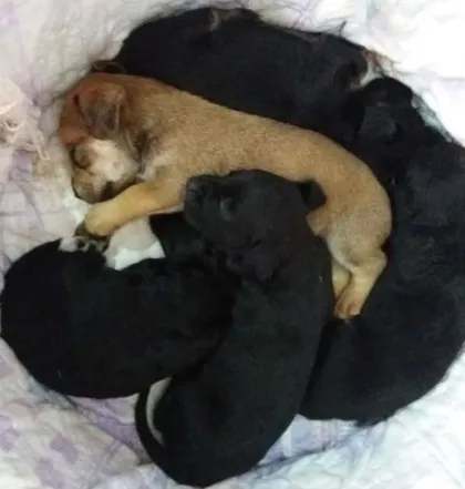 1femea pretinha uma mancha branca no peito, dois machos, um pretinho peludo e o outro marrom