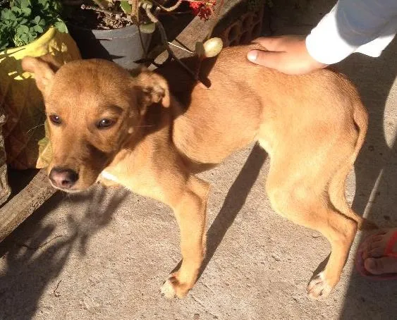 Adote a Nalla, uma cadela fêmea amarela de 2 a 6 meses, assustada e magra, mas muito mansinha. Encontre amor em Porto Alegre/RS.