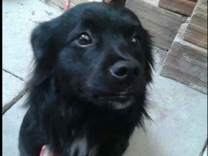 Cãozinho sem raça definida, pelagem preta com o peito branco e alguns detalhes do queixo e rabo, também, muito dócil e ativo, porte pequeno, peludinho.