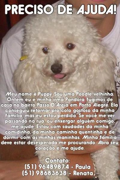 PRECISAMOS DE AJUDA. ESTAMOS PROCURANDO PELA PUPPY. ELA FUGIU NA NOITE DO DIA 10/12/2013, NO BAIRRO PASSO D AREIA EM PORTO ALEGRE. ELA TEM 9 ANOS, PELAGEM BRANCA E É DA RAÇA POODLE. CAMINHA MANCANDO POIS TEM UMA PLATINA NA PATA TRASEIRA. QUEM TIVER QUALQUER INFORMAÇÃO, POR FAVOR, EM CONTATO COM RENATA (51) 98683638 ou PAULA (51) 96489874.