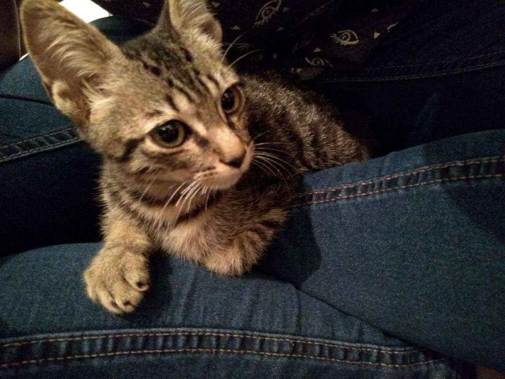 Encontramos essa gatinha na traseira de um caminhão bem na nossa frente, encolhidinha num espacinho acima da placa. Antes que a sinaleira abrisse, meu namorado saiu do carro correndo e pegou ela. Trouxemos ela pra casa, demos banho, vermífugo e tiramos as pulgas, mas não podemos ficar com ela pois nossos pets não aceitaram ela de jeito nenhum (gata mais velha dele e minha pitbull).