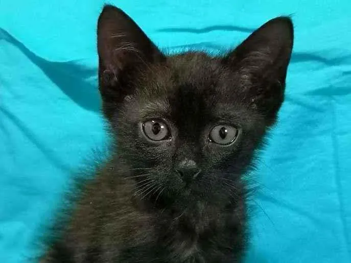 Tem cerca de 3 meses, usa a caixa de areia e come ração.