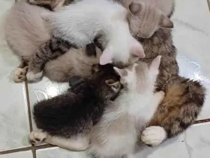 Estão com 45 dias, serão doados quando desmamarem. A mãezinha será castrada em breve.