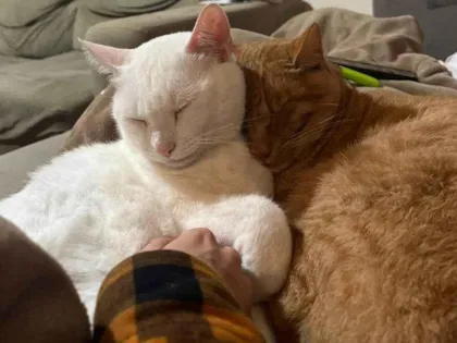 Idade entre 15 e 18 meses, castrados, negativos para Fiv e Felv. Se dão bem "somente entre eles". São carinhosos, comportados, Oliver (Branco), tem deficiência auditiva. Foram encontrados na rua, e resgatados por uma moça, que precisou se mudar, então eles ficaram para adoção novamente. Foram para um lar temporário, ficaram por lá algum tempo, até serem adotados, mas infelizmente não se adaptaram com os outros gatos da casa, estressando os felinos, que já residiam lá, ao ponto de fazerem as necessidades em locais variados. Foram adotados outra vez, mas o casal se separou , e eles ficaram sem lar de novo. Voltaram para o LT, onde aguardam por uma nova família, que os receba com muito amor, e que fique com eles, sem volta, desta vez!