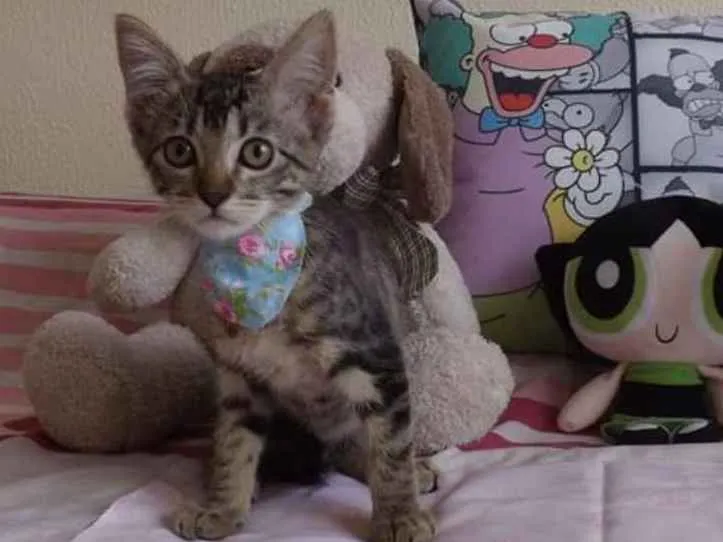 Tem aproximadamente 3 meses, usa a caixa de areia e come ração.