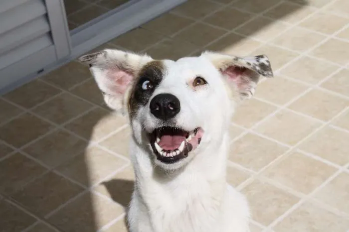 Essa é a Cookie, ela é deficiente física, não tem a patinha da frente devido a um atropelamento. Mas é super adaptada e nem sabe que tem só 3 patinhas, adora correr e brincar com outros cães,