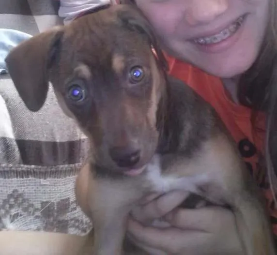 Conheça a Hazel, uma vira-lata fêmea, dócil e amorosa, com 2 a 6 meses, disponível para adoção em Sapucaia do Sul/RS. Dê a ela carinho e atenção!