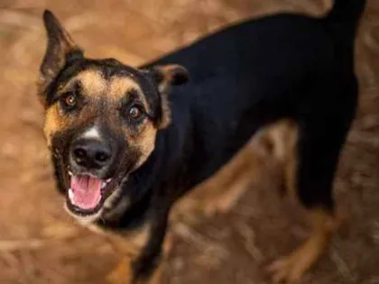 Toquinho, cão de 7 meses, porte médio, vacinado e castrado. Adora brincar, é sociável com crianças e outros animais. Pronto para adoção em Viamão/RS.