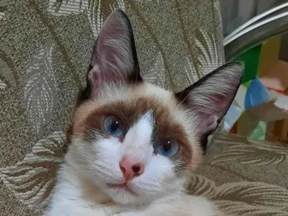 Tem uma pinta preta no nariz e olhos azuis.