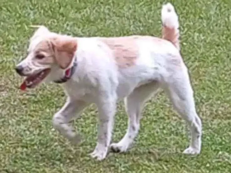 Porte médio, branca com caramelo e pintinhas nas patas e fucinho, quando fugiu estava com uma coleira cinza e uma rosa pink!