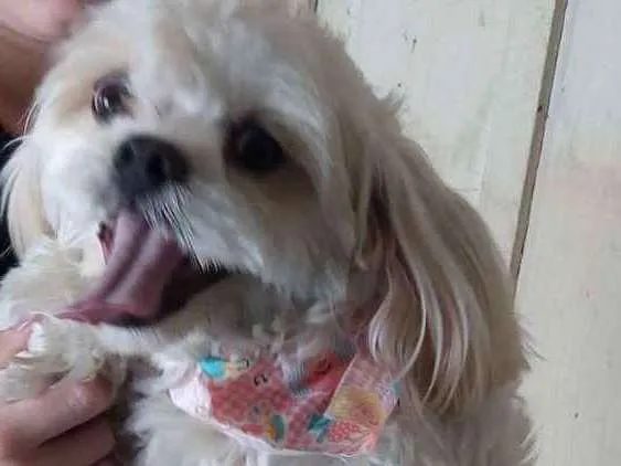 Animal de porte médio,pelagem branca,atende muito bem pelo nome de pipoca,tem um lenço da pepa em volta do pescoço.Muito brincalhão .