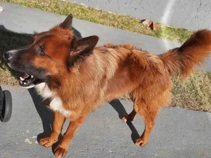 Brown é um cão dócil, mistura de chow-chow com pastor alemão, pelagem caramelo, disponível para adoção devido à falta de companhia.