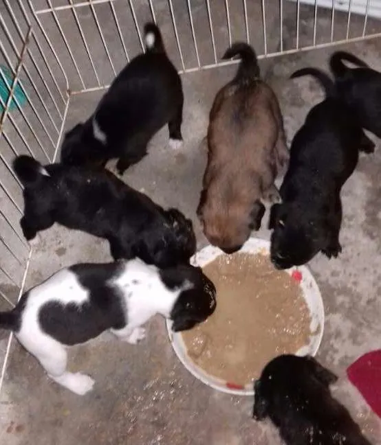Adoção de cachorrinhos Faisca: 7 machos e 1 fêmea, vira-lata misturados, de 2 a 6 meses. Eles são de São José/SC. Dê um lar amoroso!