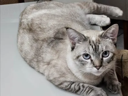 Gata mescla cinza, branco marrom. Olhos azul claro. Pesa 7kg. Está com coleira colorida e número telefone. Bairro Sul do Rio Rua José Laranjeiras 425