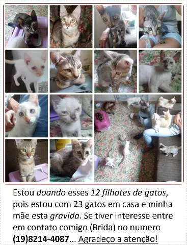 12 gatos para doar, com várias cores e tamanhos/meses entre 2 e 5 meses