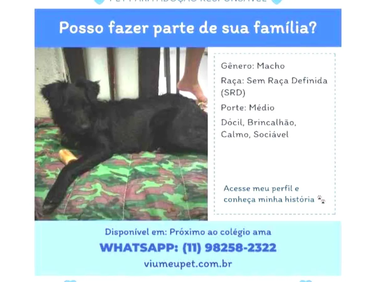 Adoção de cachorro SRD macho, 1 ano, dócil e brincalhão. Ideal para casa com quintal ou apartamento. Perfeito para famílias e crianças. Carapicuíba/SP.
