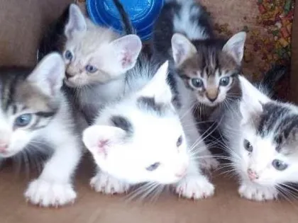 Cinco gatinhos que foram encontrados num escadão dentro de uma caixa de papelão...
