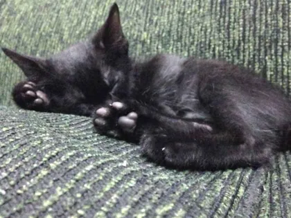 Filhote de gato preto, mas ele tem uma manchinha na barriga e na cabeça branca, ele adora brincar e gosta de ficar junto.