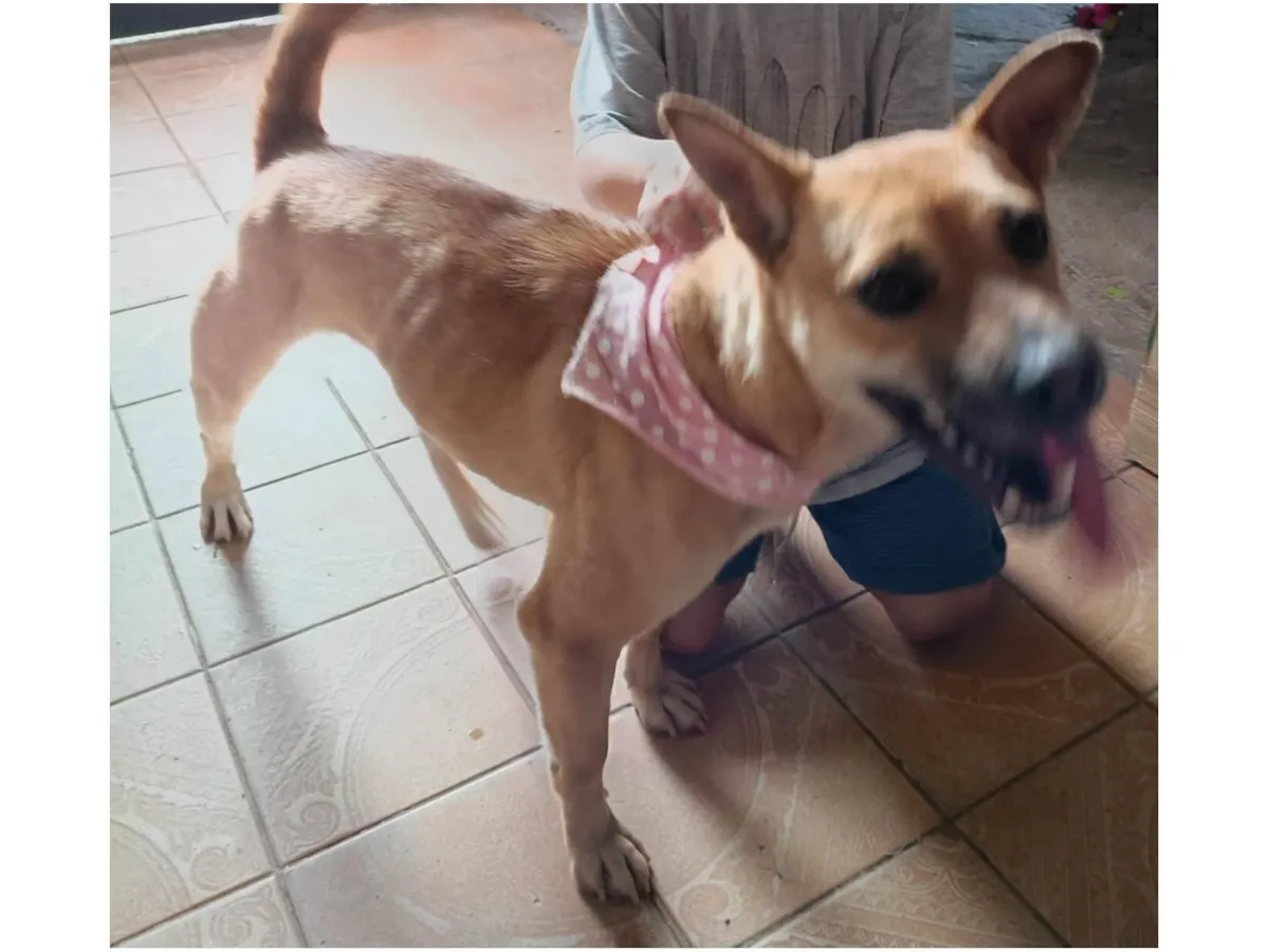 Adote a Lua, cadela caramelo de 1 ano, resgatada e pronta para amor. Dócil, brincalhona e sociável, precisa de um lar fixo e acolhedor. Ajude-a!