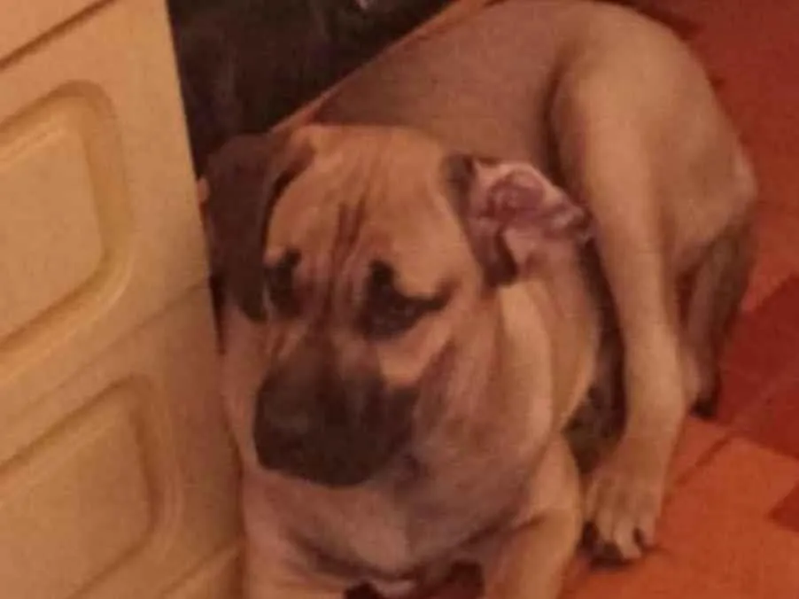 Cachorro dócil para adoção, resgatado com 40 dias, achava que era pequeno, mas cresceu. Preciso de um lar com espaço para ele brincar.
