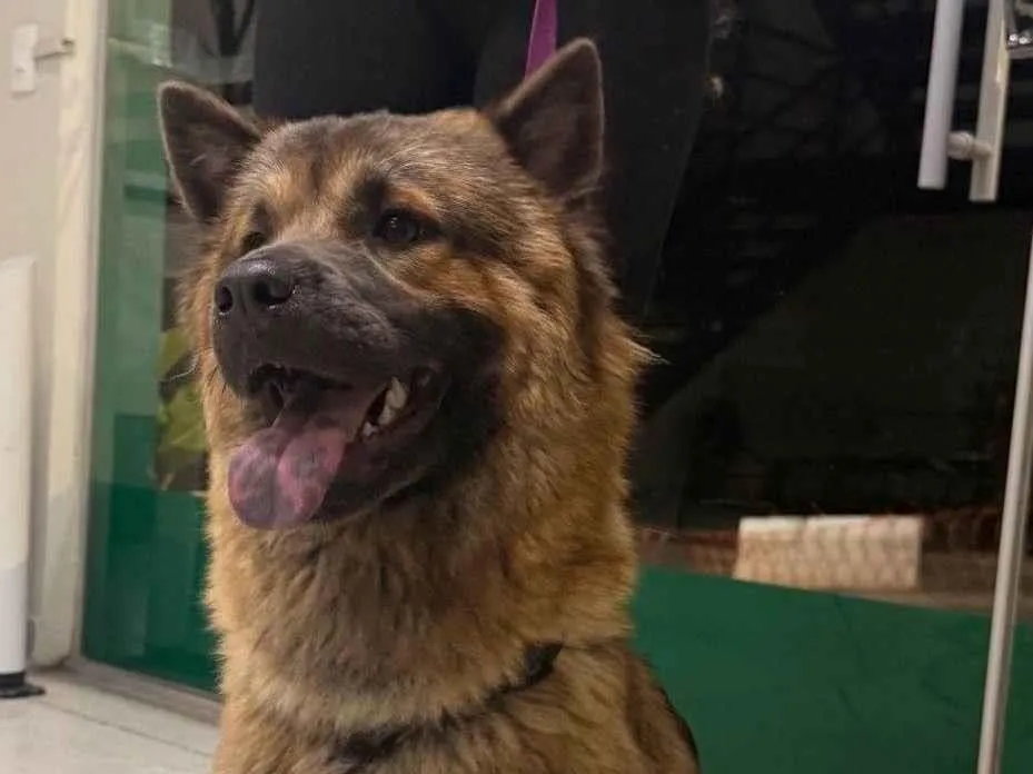 Encontrei essa menininha de porte médio (aprox. 15kg), pelagem mesclada que lembra chow chow, sem coleira e bastante assustada.