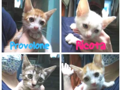 Somos 4 fofurinhas de cerca de 1 mês e meio de idade. Nos chamamos Provolone (macho), Ricota (fêmea), Kiwi (fêmea) e Polenta (macho). Fomos resgatados na rua, passando fome. Agora estamos em um lar provisório e procuramos um lar seguro onde possamos ganhar muito amor e carinho.