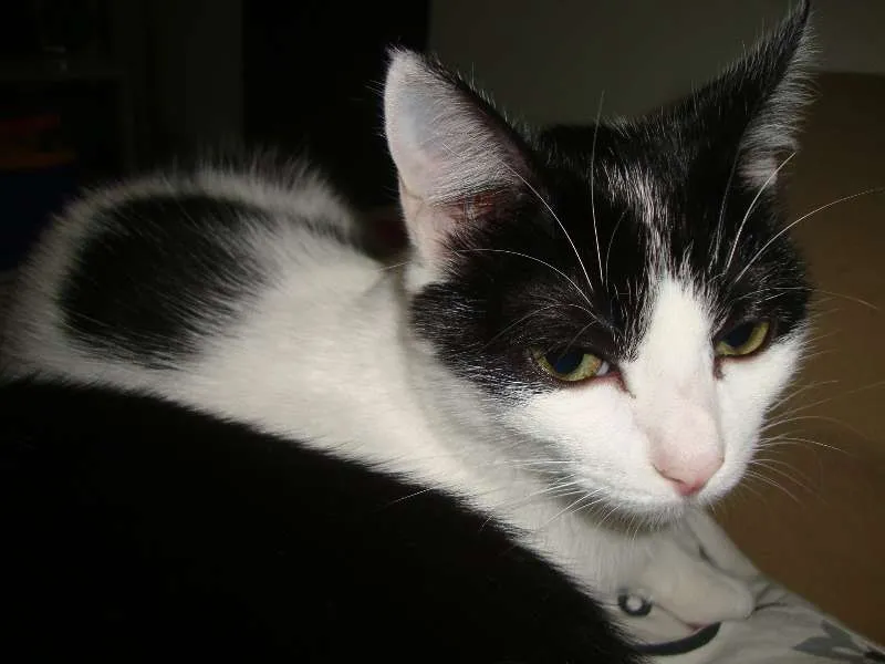 Eu, Simmons, sou esse que tem a manchinha preta se estendendo até o narizinho. Sou mais chameguento e AMO carinho. Já meu irmão Stanley prefere correr e brincar atrás de bolinhas de papel. Mas quando ele vê nossa protetora também vai logo abraçando ela e pedindo carinho na cabeça.