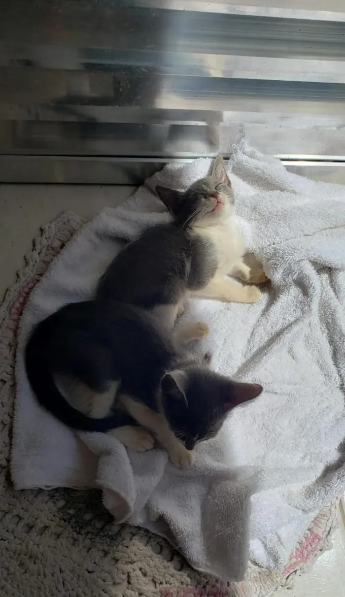 Eles tem em torno de 2 meses, já foram vermifugados, a pelagem é curta (SDR)branca e cinza, os olhinhos verdes e são extremamente carinhosos. Gostam muito de ficar em nossa companhia.