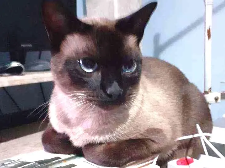Gato siamês chocolate, porte grande marrom escuro, dócil, atende pelo nome Purilin