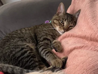Ollie, gato macho SRD de 1 ano, castrado e dócil, está perdido em Itapevi/SP. Brincalhão e carente, ideal para casa com quintal e pets. Ajude a encontrá-lo!
