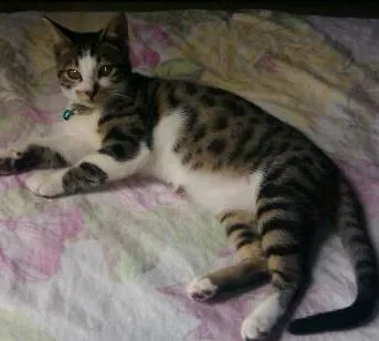 Sua pelagem é tigresa com branco. Lindo!!!