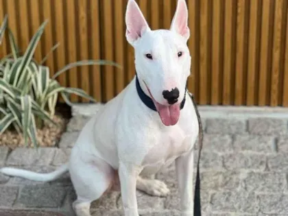 Bull Terrier macho, 4 anos, castrado e com todas as vacinas em dia. É muito dócil com adultos, gosta de caminhadas e está acostumado a fazer as necessidades apenas na rua.