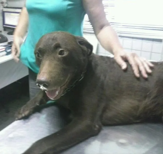 Segundo o veterinário, ele é mestiço de labrador chocolate, com cerca de 3 anos de idade.