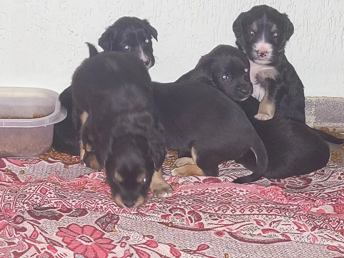 Filhotes fêmeas e machinhos raça border collie, pelagem preta com detalhes brancos e marrons.