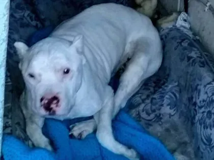 Cachorro da raça pitbull , manço , branco , lindo , encontra- se com as pernas de trás fracas , porém estou doando por não ter condições de ajuda-lo