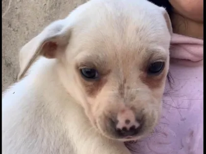 Adote essa filhote SRD-Vira Lata de pelagem branca. Sociável, dócil e adaptável, ela será uma companheira perfeita para sua família. Conheça e encante-se!
