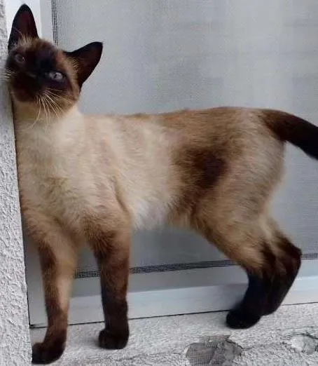 O siamês é macho e tem aproximadamente seis meses.
