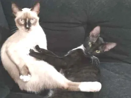 Artur e Lancelote nasceram em 13/09/20 e foram resgatodos com 04 dias. Após a doação de um irmão e da mãezinha ficaram inseparáveis, brincalhões e carinhosos, Lancelote é mais tímido e Artur mais ousado. Estão castrados e vermifugados. Procuram um lar carinhoso e seguro (casa ou apartamento com tela nas janelas, sem acesso a rua).