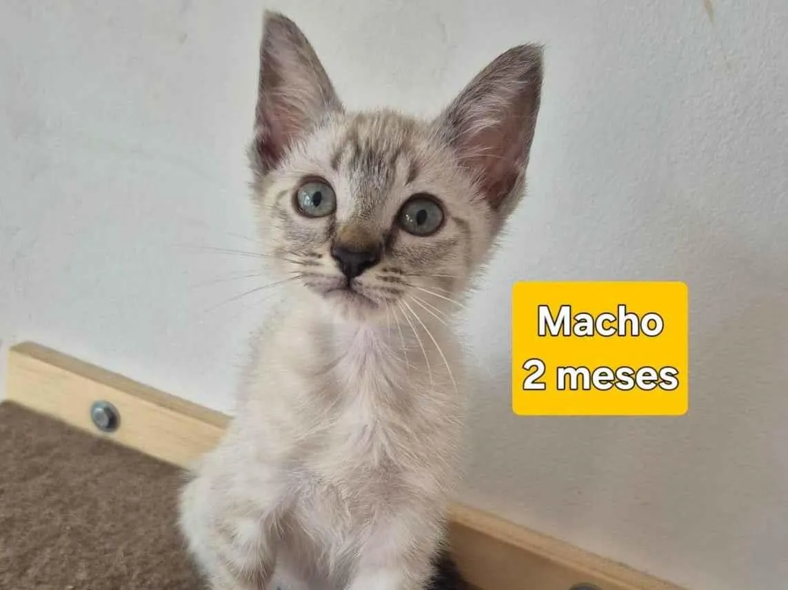 Conheça o Guto, um adorável gato macho da raça SRD-Vira-Lata, com pelagem branca e bege, 2 meses de idade.