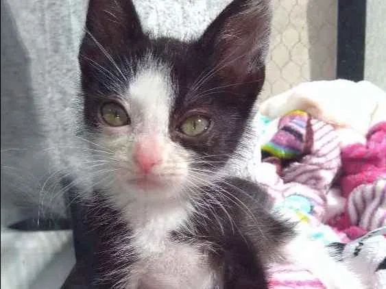 Gatinha fêmea, pelagem tipo frajola, necessita urgente de um lar. Menos de dois meses, já se alimenta de ração molhada.